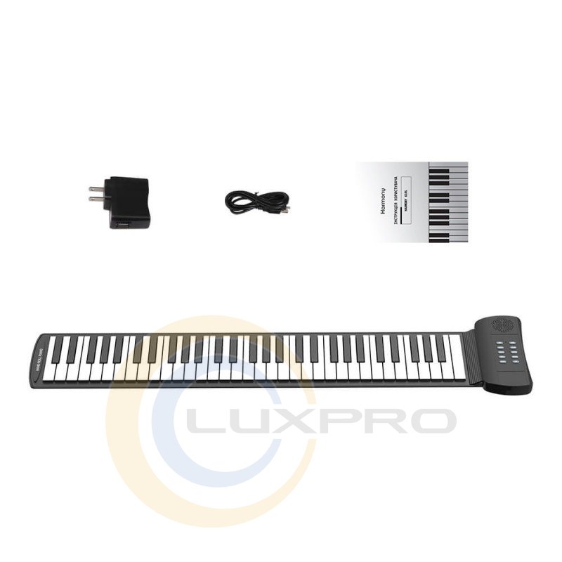 Комплектация включает гибкое пианино с 61 клавишей, инструкцию пользователя и USB-кабель для зарядки. Благодаря весу менее 1 кг инструмент идеально подходит для домашнего использования, путешествий или музыкальных занятий в дороге.