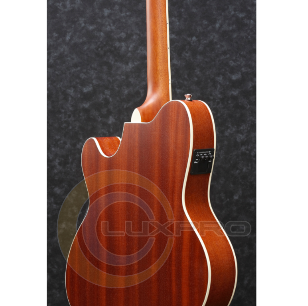 Электроакустическая гитара TCY12E-OPN. Гриф выполнен из окуме, обеспечивающего стабильность и удобство во время игры. Накладка грифа и бридж сделаны из Purpleheart – твердой породы древесины с характерным красновато-фиолетовым оттенком, придающей звук ясности верхних частот и плотности в среднем диапазоне.