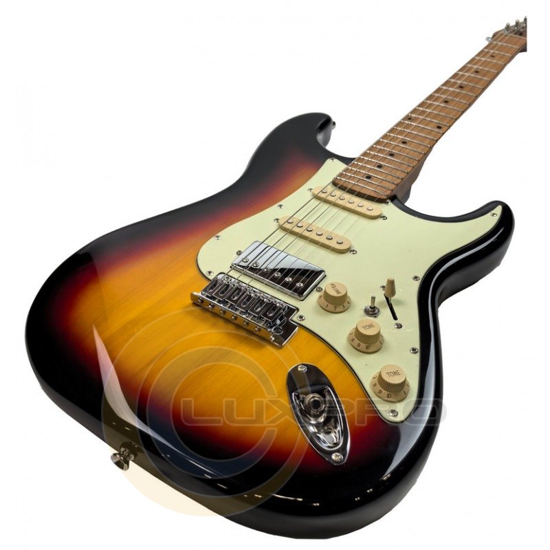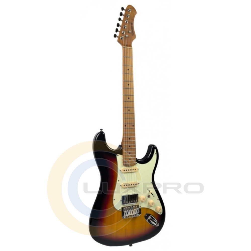 Электрогитара TEST-600 SB. Легкий корпус из тополя обеспечивает комфорт во время игры и сбалансированный тон, а гриф и накладка из термообработанного клена придают стабильность, улучшают резонанс и дарят уверенность в каждой ноте. Конфигурация звукоснимателей SSH делает инструмент универсальным: от кристально чистого звучания для джазовых импровизаций до насыщенной нагрузки для роковых рифов.