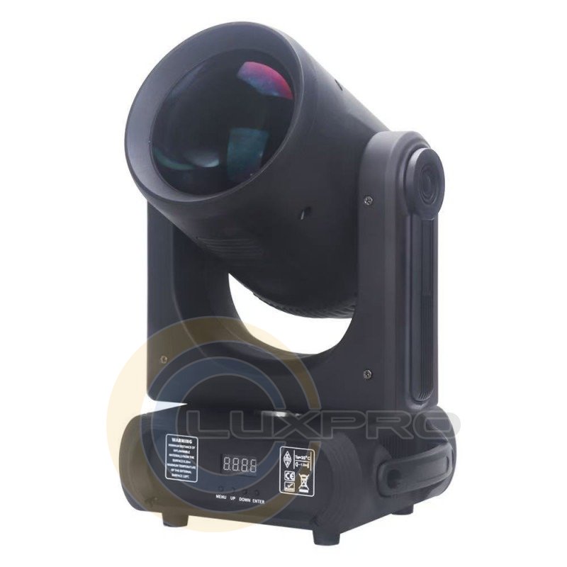 Светодиодная LED голова LED BEAM 200. Прожектор оснащён цветовым колесом с 11 цветами и белым, гобо-диском с 14 узорами, а также 18-гранной вращающейся призмой для создания объёмных эффектов. Линейное затемнение от 0 до 100%, стробоскоп до 25 Гц, электронная фокусировка и эффекты световой полосы, мультицвета и атомизации дают широкие возможности для постановок.