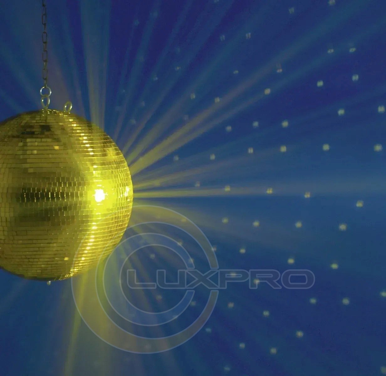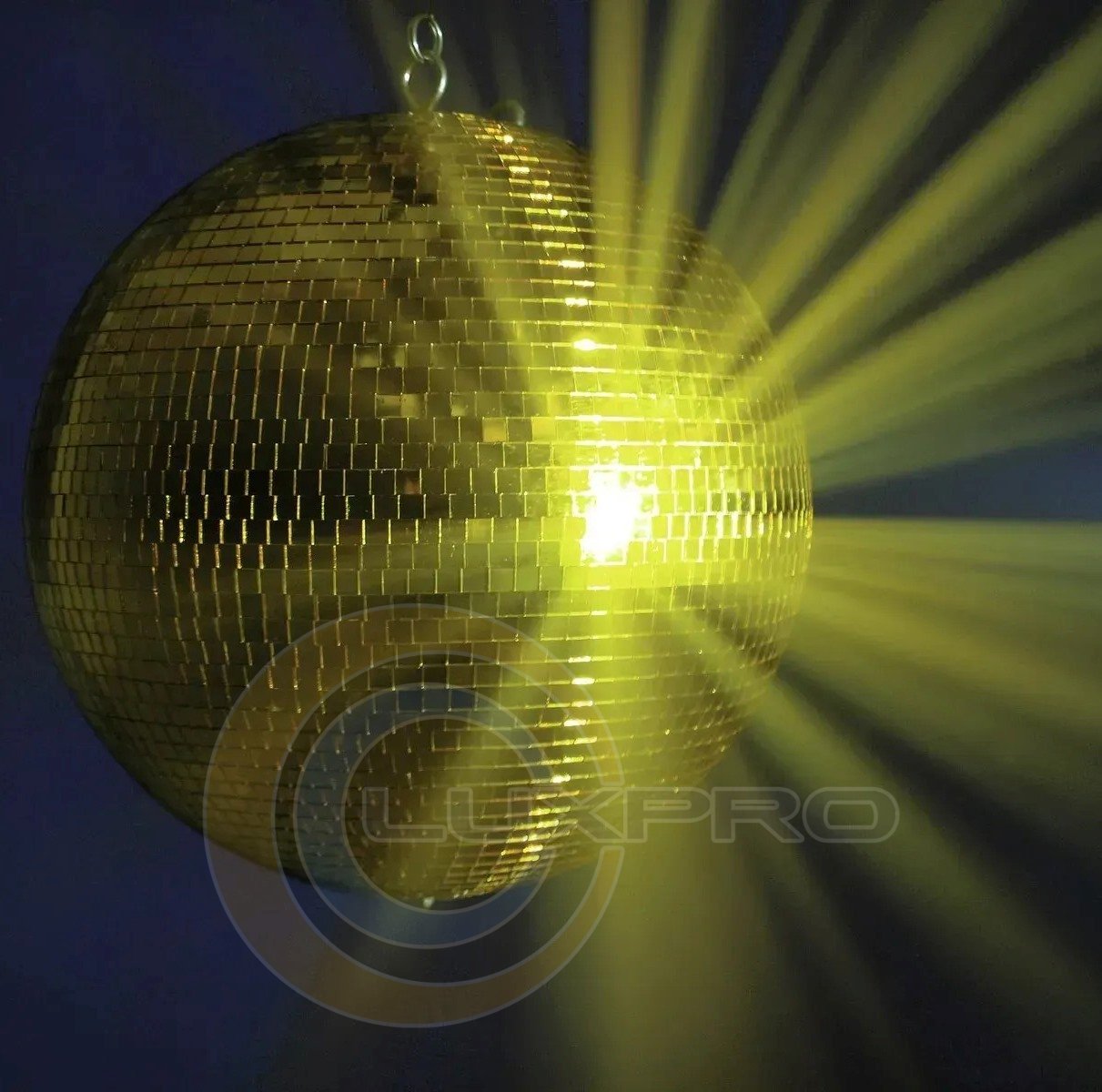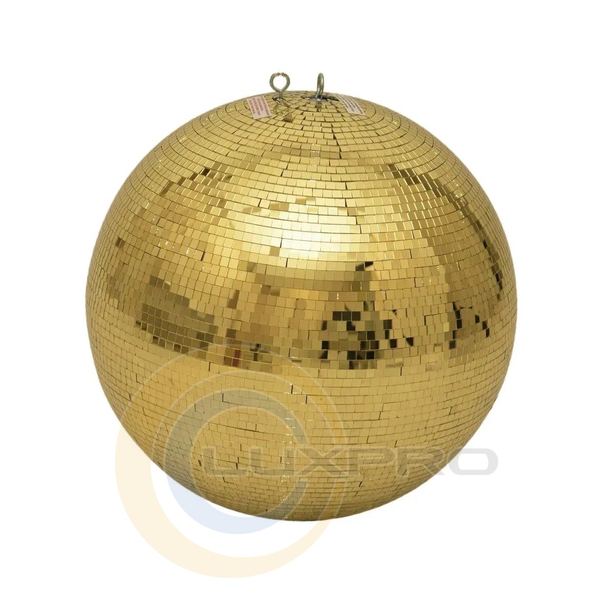 Зеркальный шар Mirror Ball 40cm. Эта модель профессионального качества имеет диаметр 40 см и покрыта бесчисленным количеством маленьких зеркал золотистого цвета (10 х 10 мм). Прочный пластиковый стержень покрыт сотнями маленьких зеркальных граней и обладает непрерывным валом, что гарантирует высокую прочность на разрыв. Зеркальный шар также имеет два ушка, позволяющих прикрепить как крепежную цепь, так и необходимую защиту от падения.