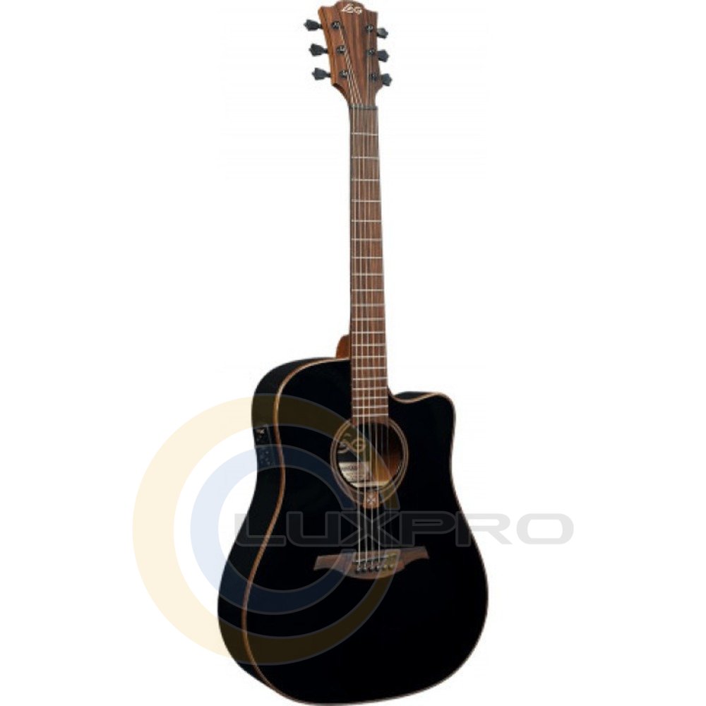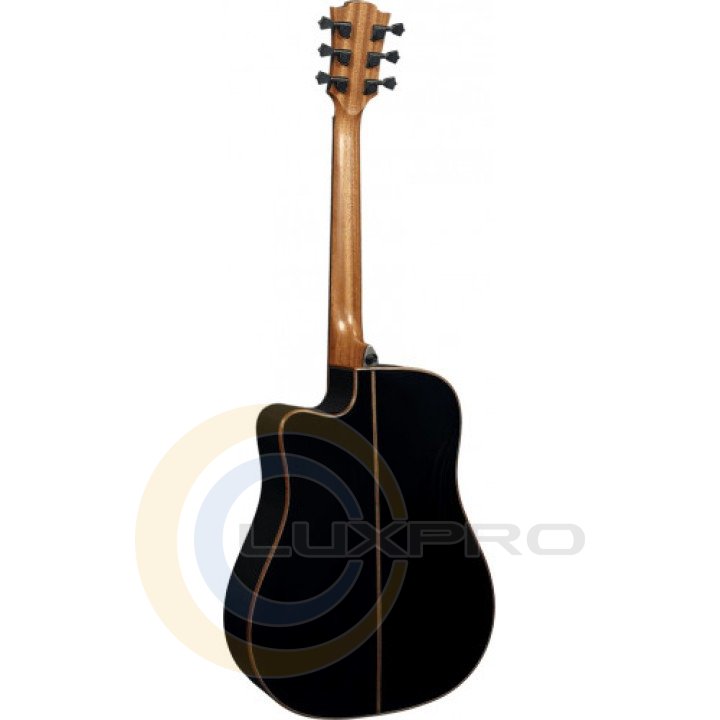 Электроакустическая гитара Tramontane T118DCE-BLK. Гриф сделан из тропической хайи и имеет качественную накладку из палисандра. Председатель грифа и бридж также выполнены из палисандра. Верхний и нижний порожки сделаны из черного графита и имеют размеры соответственно 43 и 72 мм. Мензура гитары составляет 650 мм. Гриф имеет 20 ладов без инкрустации. Также гитара может похвастаться двухсторонним анкером, закрытыми кольями (Die-cast), изысканной декоративной инкрустацией розетки, логотипом на голове грифа выполненного из клена, а также 3-полосной системой усилителя EQ с тюнером. Модель представлена в черном цвете с глянцевым покрытием.