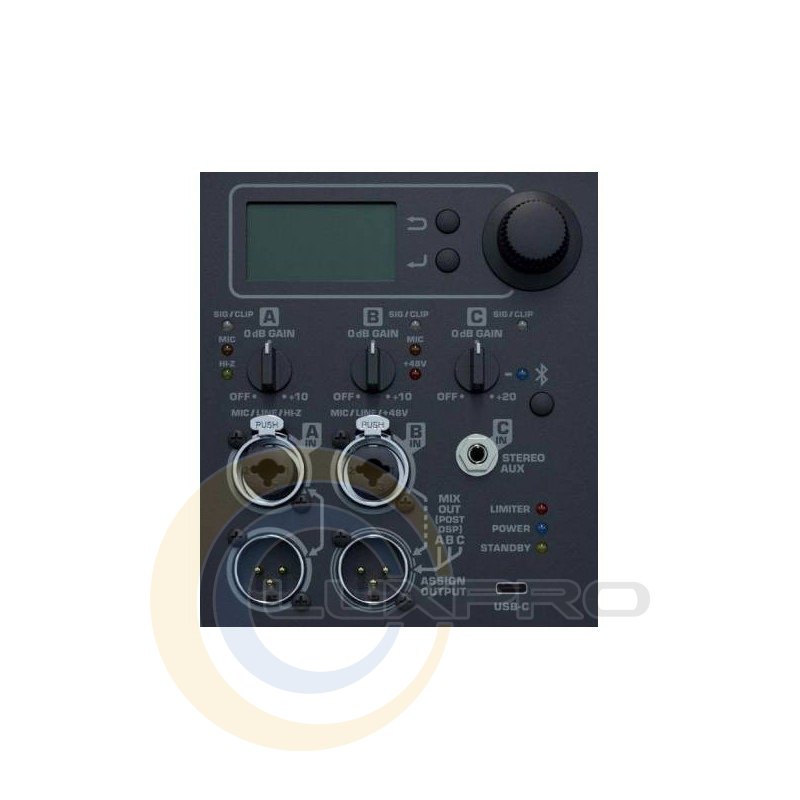 - Многофункциональный цифровой дисплей для управления и выбора функций громкоговорителя, включая глобальный параметрический эквалайзер, уровень сабвуфера, предустановки и сцены, конфигурацию Bluetooth, а также задержку (200 мс) или реверберацию.
