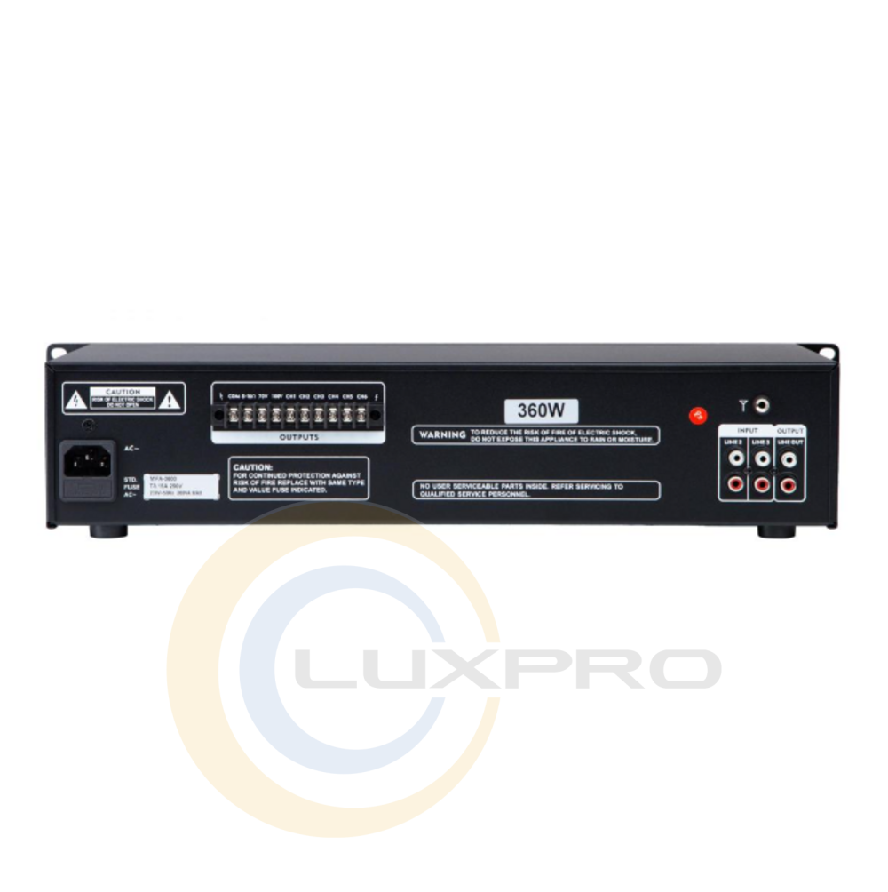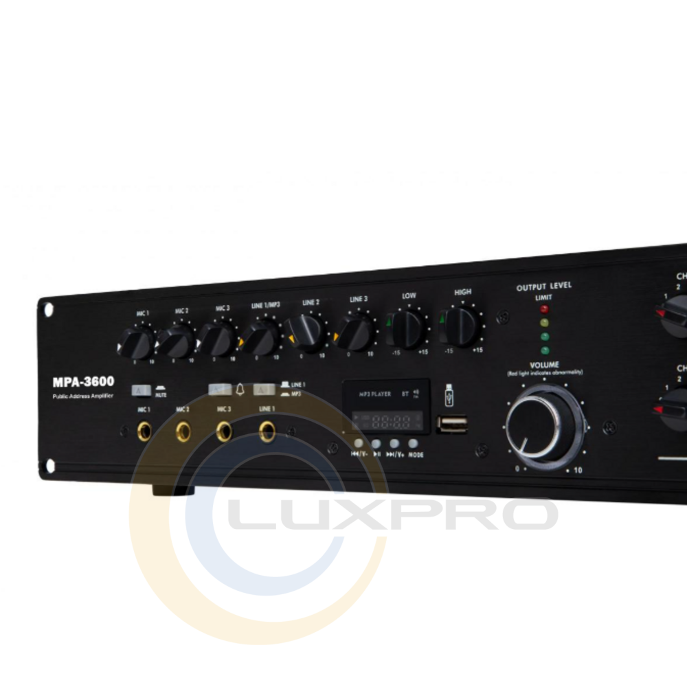 Трансляционный усилитель мощности MPA-3600 (6-ZONE). В сравнении со своимим конкурентами трансляционный усилитель MPA-3600 является более портативным за счет легкого веса и малого потребления электроенергии. Данная модель оснащена защитой от перегрева, перенапряжения, перегрузки по току, короткого замыкания, ограничением входного сигнала, ограничением выходного тока и другими комплексными системами защиты.