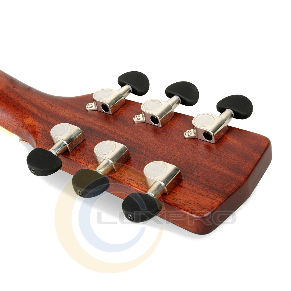 Резонаторное отверстие и корпус, декорированные тигровым акрилом, подчеркивают красоту и изящность инструмента. Кроме того, гриф и задняя дека также имеют окантовку, защищающую гитару от повреждений.Оригинальный струнодержатель