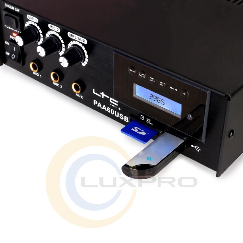 Портативный усилитель PAA60USB - для мобильного использования с питанием от 12В батареи (автомобиль, лодка и т.д.) или в виде фиксированной установки. PAA60USB оснащен MP3-плеер с USB/ SD, сиреной и экраном управления MP3 с синей подсветкой ЖК-дисплея.