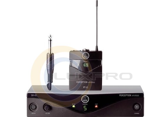Передатчик PT45 в комплекте AKG Perception Wireless 45 представляет собой высокопроизводительное аналоговое беспроводное устройство для электрогитар, бас-гитар, гарнитур и т.д. Совместимость обеспечивается благодаря профессиональному разъему mini-XLR на корпусе. Можно регулировать громкость прямо на передатчике. Питание трансмиттера осуществляется с помощью одной батареи АА на срок от 8 до 14 часов непрерывной работы в зависимости от батареи, есть индикатор заряда. Диапазон уверенного приёма составляет 30 метров.