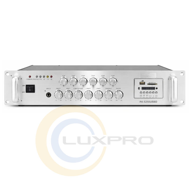 Усилитель мощности PA-5250USBDS. Оснащений вбудованим MP3-плеєром з підтримкою USB/SD-карт та Bluetooth, двома мікрофонними входами (MIC 1 з функцією безшумного пріоритетного підключення для екстрених оголошень), трьома аудіовходами, регулюванням тембру та незалежним регулюванням гучності по кожній з 6 зон. Має повний набір захистів та пульт дистанційного керування. Ідеально підходить для великих об’єктів з потребою в зональному мовленні, пріоритетних оголошеннях та надійній роботі 24/7.