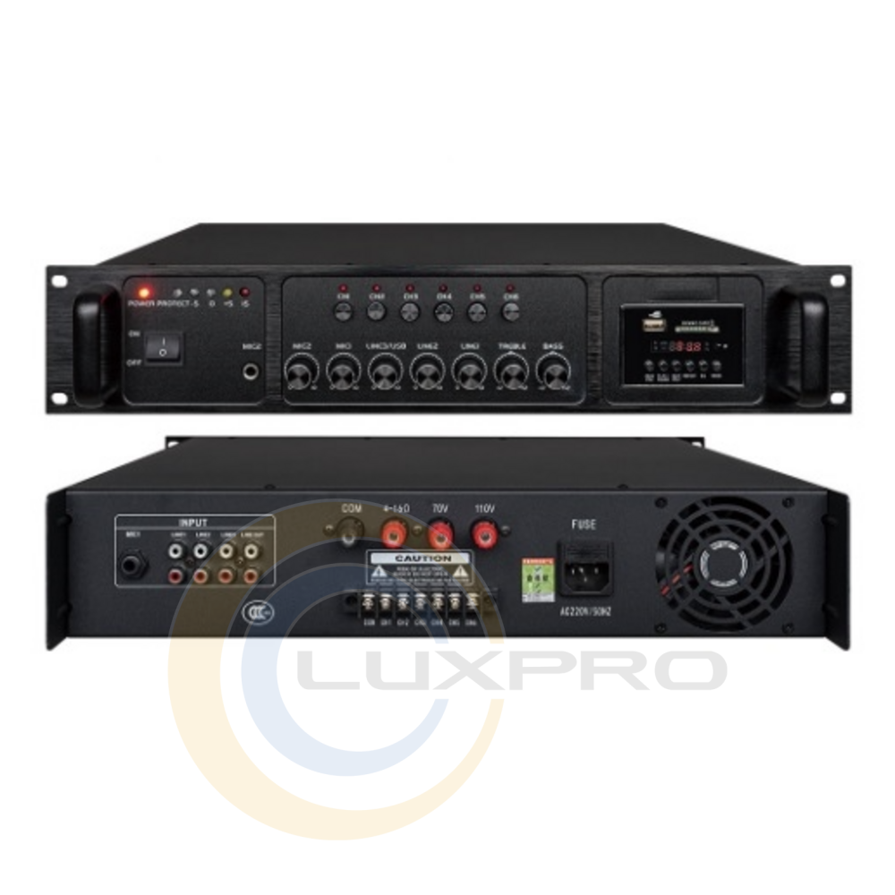 Усилитель мощности PA-5350USBD. Оснащен встроенным MP3-плеером с поддержкой USB/SD-карт и Bluetooth, двумя микрофонными входами (MIC 1 с функцией бесшумного приоритетного подключения для экстренных объявлений), тремя аудиовходами, регулировкой тембра и независимой регулировкой громкости по каждой из 6 зон. Полный набор защит и пульт дистанционного управления обеспечивают безотказную работу 24/7 даже при максимальной нагрузке. Идеально подходит для объектов экстремально большой площади с высокой шумностью и потребностью в сверхмощной зональной речи с приоритетными объявлениями.