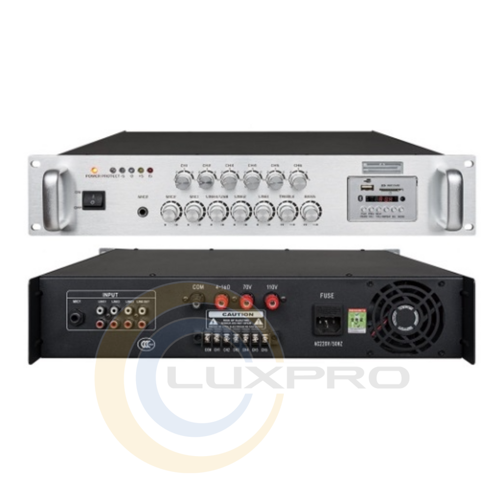Усилитель мощности PA-5700USBDS. Оснащен встроенным MP3-плеером с поддержкой USB/SD-карт и Bluetooth, двумя микрофонными входами (MIC 1 с функцией бесшумного приоритетного подключения для экстренных объявлений), тремя аудиовходами, регулировкой тембра и независимой регулировкой громкости по каждой из 6 зон. Полный набор защит и пульт дистанционного управления обеспечивают безотказную работу 24/7 даже при максимальной нагрузке. Идеально подходит для объектов экстремально большой площади с высокой шумностью и потребностью в сверхмощной зональной речи с приоритетными объявлениями.