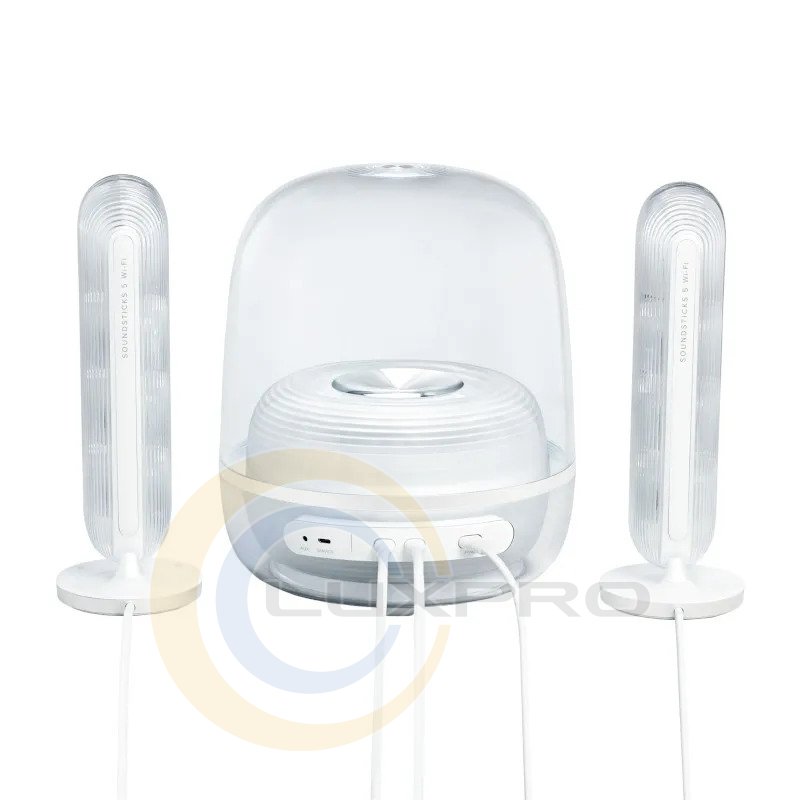 SoundSticks 5 Wi-Fi заново представляет свой культовый силуэт в светлом белом исполнении, которое добавляет любому пространству непринужденной элегантности. Полностью прозрачный купол и прозрачные сателлитные колонки дополнены отполированными металлическими деталями — для чистой, изысканной эстетики, идеально подходящей современным интерьерам. Каждый элемент создан для простоты: от лаконичного заднего блока подключений до отзывчивых сенсорных кнопок на основании правой колонки. В результате — премиальный опыт, который выглядит утонченно и ощущается легко.