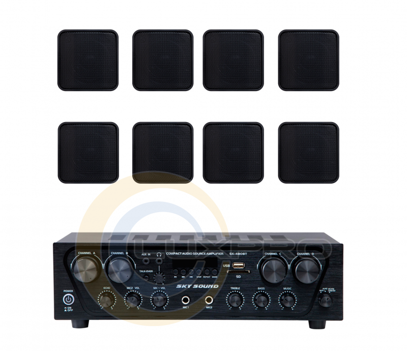 Акустический комплект SKY SOUND SKW-4808VS BLACK состоит из 4 пар (8 шт.) настенных акустических систем SKY SOUND VS-6B/TB (Black) и одного многозонного усилителя мощности SKY SOUND SK-480 (4*80W). Комплект системы озвучивания предназначен для фоновой музыкально-речевой озвучки в небольших помещениях: офисах, магазинах, кафе, салонах красоты, гостиничных номерах, коридорах, учебных классах и других объектах.