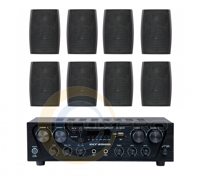 Акустический комплект SKY SOUND SKW-4808LS BLACK состоит из 8-ми настенных акустических систем SKY SOUND LS-35B/TB (Black) и одного многозонного усилителя мощности SKY SOUND SK-480 (4*80W). Комплект системы озвучивания предназначен для широкого спектра объектов: кафе, ресторанов, офисов, магазинов, учебных аудиторий, конференц-залов, гостиничных номеров, а также наружных пространств - террас, беседок, открытых площадок, где требуется универсальная музыкально-речевая трансляция и голосовое оповещение с возможностью установки под разными углами.