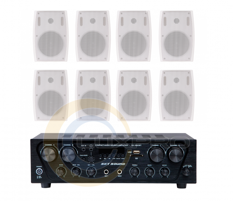 Акустический комплект SKY SOUND SKW-4808LS WHITE состоит из 8-ми настенных акустических систем SKY SOUND LS-35B/TB (WHITE) и одного многозонного усилителя мощности SKY SOUND SK-480 (4*80W). Комплект системы озвучивания предназначен для широкого спектра объектов: кафе, ресторанов, офисов, магазинов, учебных аудиторий, конференц-залов, гостиничных номеров, а также наружных пространств - террас, беседок, открытых площадок, где требуется универсальная музыкально-речевая трансляция и голосовое оповещение с возможностью установки под разными углами.