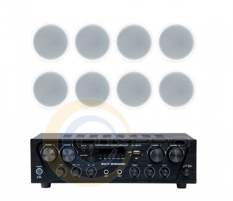 Акустический комплект SKY SOUND SKC-4808S состоит из 8 потолочных акустических систем SKY SOUND S-2631W/TW и одного многоканального усилителя мощности SKY SOUND SK-480 (4*80 Вт). Комплект системы озвучки предназначен для средних и больших помещений, кафе, ресторанов, баров, офисов, магазинов, торговых центров, фойе и других общественных пространств, где требуется качественный звук и голосовое оповещение.