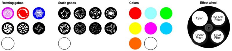 - 1 колесо гобо с вращением, 7 взаимозаменяемых гобо (3 стеклянных, 3 металлических + открытое);