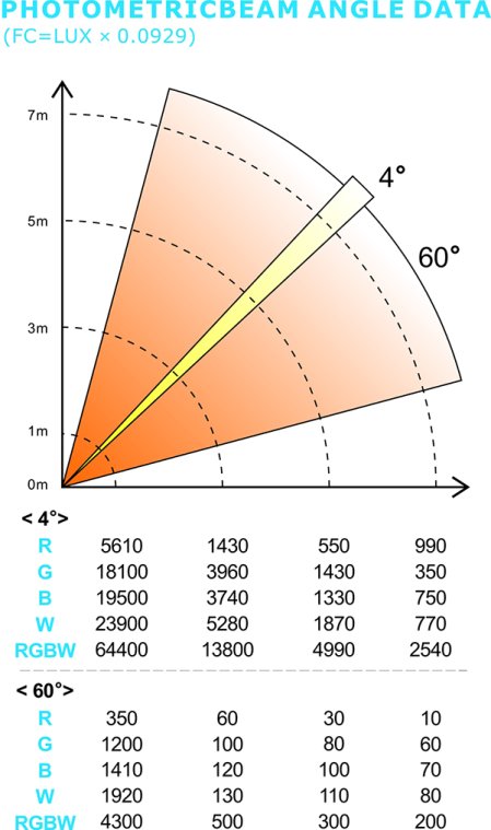 - Количество светодиодов: 7 * 15 Вт OSRAM OSTAR 4-IN-1 RGBW LEDs