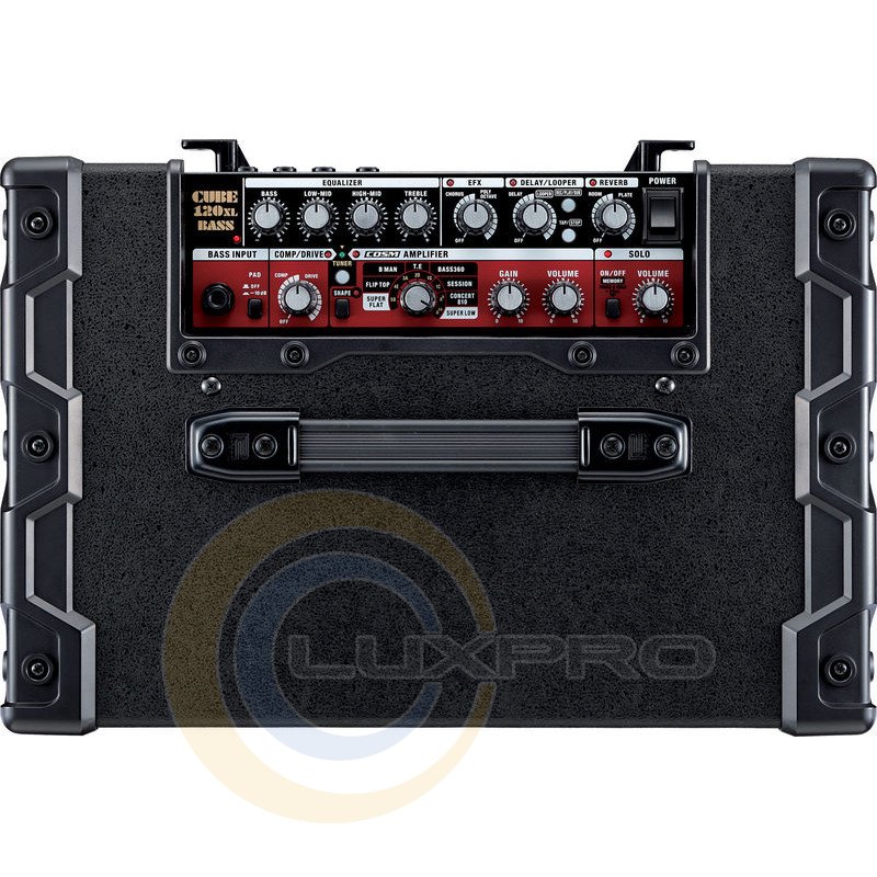 ROLAND CB120XL - компактный 120-ваттный бас-гитарный усилитель с высокоэффективным 12'' 2-диффузорным динамиком, 8 COSM-моделями усилителей, 7 эффектами, функцией Solo, секцией Phrase Looper, 4-полосным эквалайзером, хроматическим тюнером, бас-гитарным входом, линейным стереовходом, балансным XLR-выходом Line/DI, стереовыходом для наушников или записывающего устройства, разъём для подключения внешней акустической системы и 3 гнездами для подключения управляющих педалей.