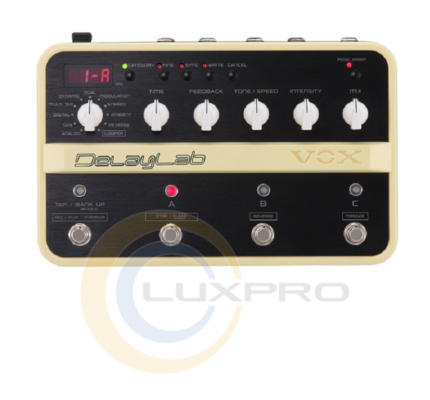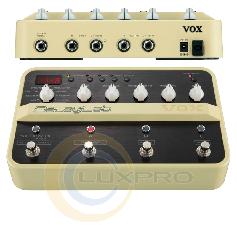 DelayLab — педаль эффектов дилей, содержит 30 различных типов задержки, стереофонический лупер, который позволяет записывать фразы длительностью до 28 секунд, а также возможность использования 30 специальных пресетных программ. Контроль над параметрами эффектов, функциями и возможностями педали организован в хорошо продуманном понятном интерфейсе.Вы можете использовать одновременно два эффекта задержки благодаря алгоритму Dual Delay. Distortion Delay даёт возможность применить эффект дисторшн только к повторениям исходного сигнала. Эффект Reverse Delay имеет возможность настройки соотношения между исходным сигналом и его перевёрнутым повторением. Алгоритм Space Delay придает звучанию глубину и окраску, характерную для оркестровых струнных инструментов.В педаль встроен стереофонический лупер, который может использоваться одновременно с эффектами задержки и по своим возможностям превосходит некоторые специализированные приборы, ранее считавшиеся лучшими в своём классе. Возможности лупера в DelayLab не ограничиваются лишь наложением записанных треков одного на другой. Среди них обратное воспроизведение записанных дорожек, воспроизведение по триггерному сигналу, последовательное ослабление громкости каждой предыдущей фразы при записи нескольких фраз, а также назначение параметров на подключаемую педаль экспрессии.В 30 пресетных программах приведены примеры использования всех функций и параметров DelayLab. Все пресетные программы доступны для редактирования и сохранения, в каждой из которых вы найдете как очень простые и универсальные, так и сложные с характерным звучанием варианты эффекта задержки. Также вы найдёте пресеты, которые содержат в себе настройки, воспроизводящие звучание эффекта задержки известных гитаристов, используемых при записи их самых известных композиций.Любой тип обработки настраивается пятью ручками на лицевой панели. Этим достигается простота управления сложными эффектами.Возможности VOX DelayLab практически безграничны. Эта педаль имеет все шансы стать новым стандартом обработки звука.Характеристики: