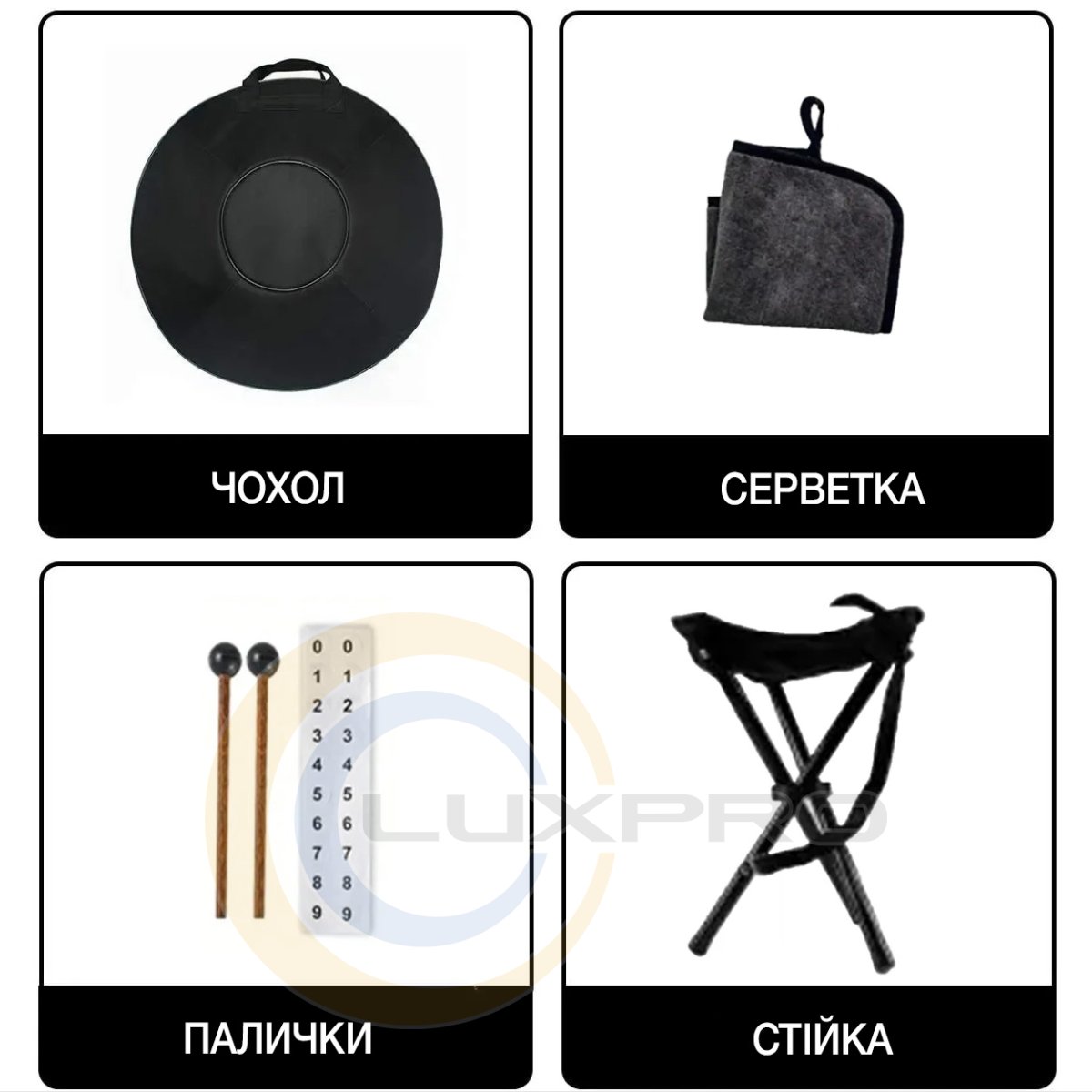 Комплектация: чехол-рюкзак, стойка, салфетка и барабанные палочки.