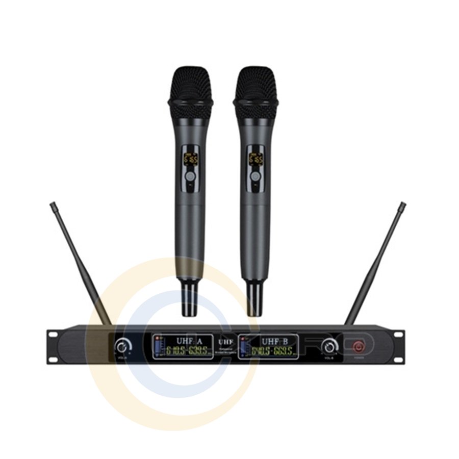 Назначение и возможностиБеспроводная двухканальная система позволяет одновременно использовать два ручных микрофона, обеспечивая независимую передачу аудиосигнала на приемник. Это удобно для дуэтов, ведущих мероприятий, интервью, лекций и выступлений на сцене.Широкий диапазон рабочих частот UHF обеспечивает стабильную передачу сигнала и минимальное количество помех даже при насыщенном радиочастотном пространстве.Система подходит для использования с концертными аудиосистемами, микшерами, усилителями и профессиональным звуковым оборудованием.Приемник системыПриемник оборудован кварцевым резонатором с частотой 24,576 МГц, что обеспечивает точную стабилизацию сигнала и стабильную работу системы.Рабочий диапазон частот составляет 500–980 МГц, что позволяет подобрать оптимальный канал передачи и минимизировать влияние радиопомех.Чувствительность приемника -94 дБм обеспечивает стабильный приём сигнала даже при значительном расстоянии между передатчиком и приемником.Максимальная амплитуда входного ВЧ-сигнала достигает 10 дБм, что позволяет системе корректно работать при разных уровнях сигнала.Максимальное выходное аудио напряжение составляет 1 В (пиковое значение), обеспечивая достаточный уровень сигнала для подключения к профессиональным аудиоустройствам.Сопротивление аудиовыходу составляет 600 Ом, что соответствует стандартам большинства аудиосистем и микшерных пультов.Качество звукаЧастотный диапазон аудиосигнала составляет 30 Гц – 20 кГц с отклонением ±2 дБ, обеспечивая естественное и детализированное воспроизведение голоса и музыкальных инструментов.Высокое соотношение сигнал/шум 96 дБ позволяет минимизировать шум фона и сохранить чистоту передачи аудиосигнала.Система демонстрирует стабильную работу даже в сложных акустических условиях, обеспечивая четкую передачу речи и вокала.Ручные микрофоны-передатчикиКаждый микрофон работает в диапазоне UHF 500-960 МГц, обеспечивая надежную передачу сигнала без проводов.Питание производится от двух батареек AA (1,5 В), что обеспечивает автономную работу и удобную замену элементов питания.Потребляемая мощность микрофона составляет около 100 мА, обеспечивая эффективную работу без излишних затрат энергии.Стабильность частоты ≤10 ppm позволяет поддерживать стойкий радиосигнал без заметных отклонений.Капсуль и направленность микрофонаМикрофоны оснащены конденсаторным капсюлем, обеспечивающим высокую чувствительность и детализированную передачу звука.Однонаправленная диаграмма направленности позволяет сосредоточить восхищение звука на источнике, снижая влияние окружающих шумов.Частотная характеристика микрофона составляет 40 Гц – 20 кГц, что обеспечивает широкий диапазон передачи вокала и речи.Чувствительность микрофона составляет –47±3 дБ при 1 кГц, позволяя точно передавать голос без искажений.Передача сигналаМаксимальная модуляция составляет 50 кГц, обеспечивая стабильную передачу аудиосигнала.Соотношение сигнал/шум превышает 105 дБ, что гарантирует чистый звук без лишних помех.Коэффициент угнетения помех соседних каналов превосходит 80 дБ, что понижает возможность взаимных помех меж каналами.Динамический диапазон свыше 100 дБ позволяет передавать как тихие, так и громкие звуковые сигналы без потери качества.Характеристики: