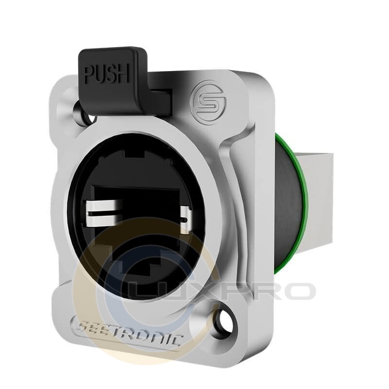 Seetronic SE8FDYH-03 – это панельный Ethernet-разъем RJ45 профессионального класса, созданный для стабильной и безопасной передачи цифровых данных в сложных условиях эксплуатации.Металлический D-образный фланец обеспечивает прочную крепь и высокую устойчивость к механическим нагрузкам, а проходная конструкция позволяет легко интегрировать разъем в коммутационные панели и корпуса оборудования.При использовании водонепроницаемой защитной крышки разъем достигает уровня защиты IP65, что делает его отличным решением для внешних инсталляций, концертных площадок и мобильных сцен.Механизм быстрой блокировки гарантирует стабильное соединение даже при вибрациях и перемещениях оборудования, обеспечивая бесперебойную передачу данных в реальных рабочих условиях.