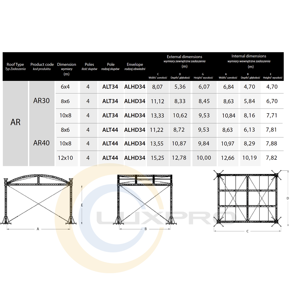 Крыша с дуговым сводом (арочная) была спроектирована для использования ее во время проведения больших мероприятий. Крыши AR-арки предназначены для мероприятий под открытым небом среднего размера. Современные крыши могут быть собраны очень быстро. Основание конструкции выполнено с применением системы QUA 290 HD3 (толщина стенки 3 мм), однако, имеется возможность выполнения конструкции с применением системы QUA 390 x 600, что значительно увеличивает грузоподъемность крыши. Обшивка крыши изготовлена из ПВХ-материала, доступного в разных цветах. Кроме того, для каждой крыши можно заказать дополнительные боковые экраны (сетки) из воздухопроницаемого материала, которые защищают сцену от ветра, дождя и т.д. Боковые экраны и обшивка крыши имеют сертификаты на огнестойкость. Каждая крыша имеет высочайшее качество. Каждый элемент тщательно проверяется. Как боковые сетки, так и материал поверхности крыши имеют сертификаты пожаробезопасности, качество материалов, из которых изготовлена крыша, находится на высочайшем уровне и оправдает все ожидания. По желанию заказчика можно провести подробный структурный анализ, чтобы подтвердить допустимую нагрузку.Дополнительно к любой крыше можно заказать боковые защитные сетки, выполненные из материала, не препятствующего проникновению воздуха.Характеристики: