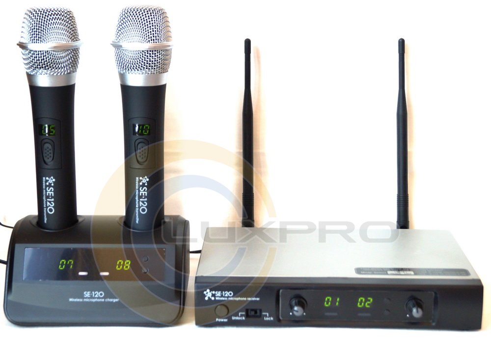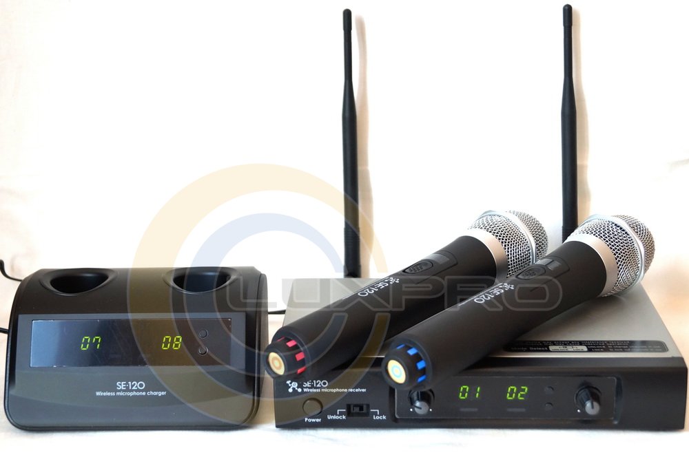 Беспроводная микрофонная система SE-120 - разработана в Корее по заказу компании «Studio Evolution» для караоке-клубов. Возможность одновременной работы до 95 микрофонов, превосходное качество звучания, усиленные аккумуляторные батареи, антивандальное покрытие корпуса микрофона, ударостойкая головка микрофона, подавление акустического эха - вот неполный список преимуществ данной радиосистемы.Микрофонная система SE-120 интересна тем, что была разработана в специально для караоке заведений и частных пользователей. Основное достоинство радиомикрофонов - высокое качество звучания и уверенная работа системы подавления акустического эха. Кроме того, не секрет, что гости караоке клубов не всегда бережно относятся к таким дорогим устройствам как радиомикрофоны. Падение микрофонов, откручивание микрофонных головок, закручивание микрофонного батарейного отсека до срывания резьбы - это далеко не полный список проблем, который мы наблюдаем ежедневно в караоке клубах независимо от места их расположения и статуса заведения.Поэтому в разработке микрофонов SE-120 была учтена специфика работы данных беспроводных систем. Антивандальная микрофонная головка с усиленной сеткой, антиролл - специальное каучуковое кольцо, которое не дает микрофону скатиться с поверхности и упасть, прорезиненное покрытие корпуса микрофона. Усиленные аккумуляторные батареи, два микрофона на базе, удобная зарядка микрофонов.ОСОБЕННОСТИ: