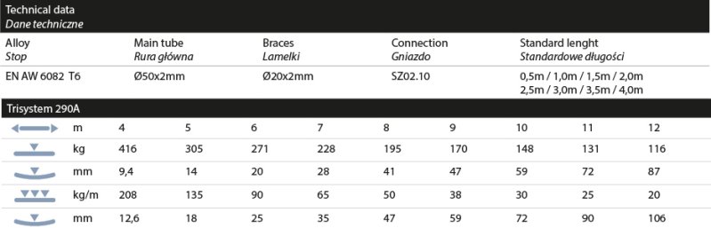 Ферма TRI 290 A выполнена из трубы 50 x 2 мм и перемычек 20 x 2 мм, оборудована коническим коннектором - гнездом SZ 02.10. Алюминиевая ферма благодаря своей конструкции имеет привлекательный, не громоздкий вид и большую выносливость, высокую устойчивость к воздействию на них больших нагрузок.