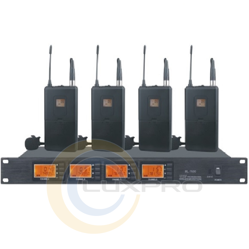Микрофонная система RL-7800BP 4-х канальная UHF беспроводная микрофонная система с наголовной гарнитурой (или петличкой - на выбор) на каждый канал. Электропитание приемника - DC 12V / 1000mA, питание передатчика - AA1.5V X 2 батареи.