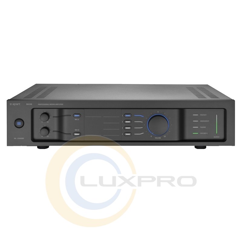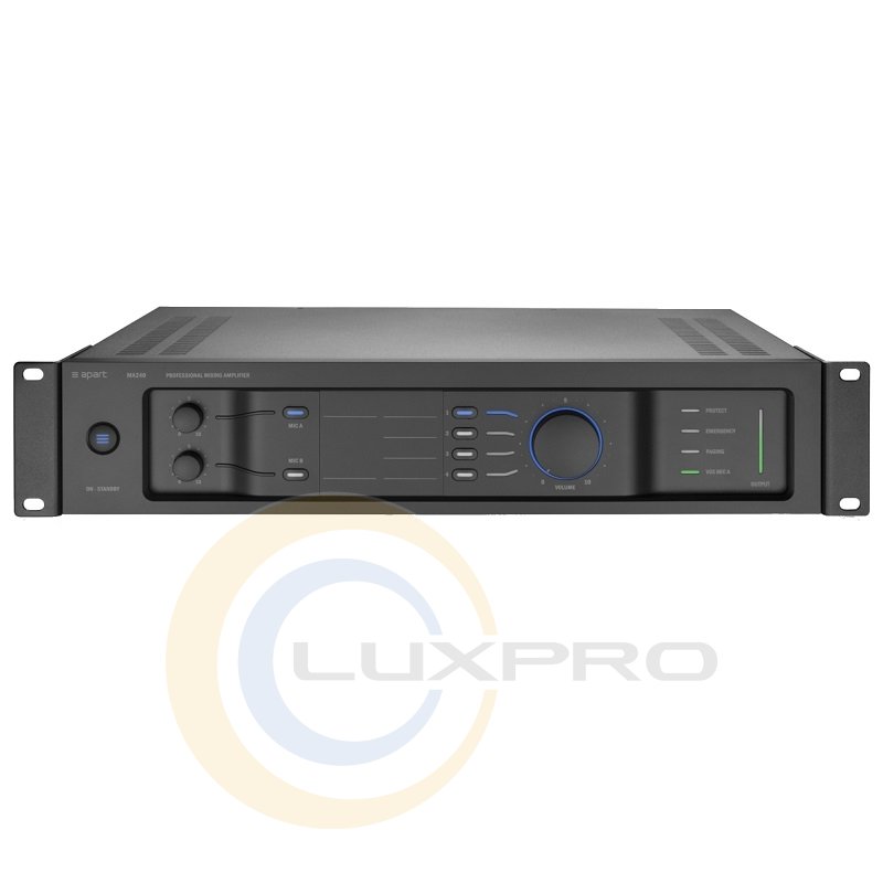 Микшер-усилитель Apart MA240 лицевая панель усилителя наконец-то стала намного красивее, информативнее, и удобнее в использовании. Усилитель стал по-настоящему современным и намного более совершенным не только технически, но и визуально. Корпус MA240 - традиционно позволяет монтировать его в стандартную 19” стойку, или использовать его как настольный вариант, без рэковых креплений.
