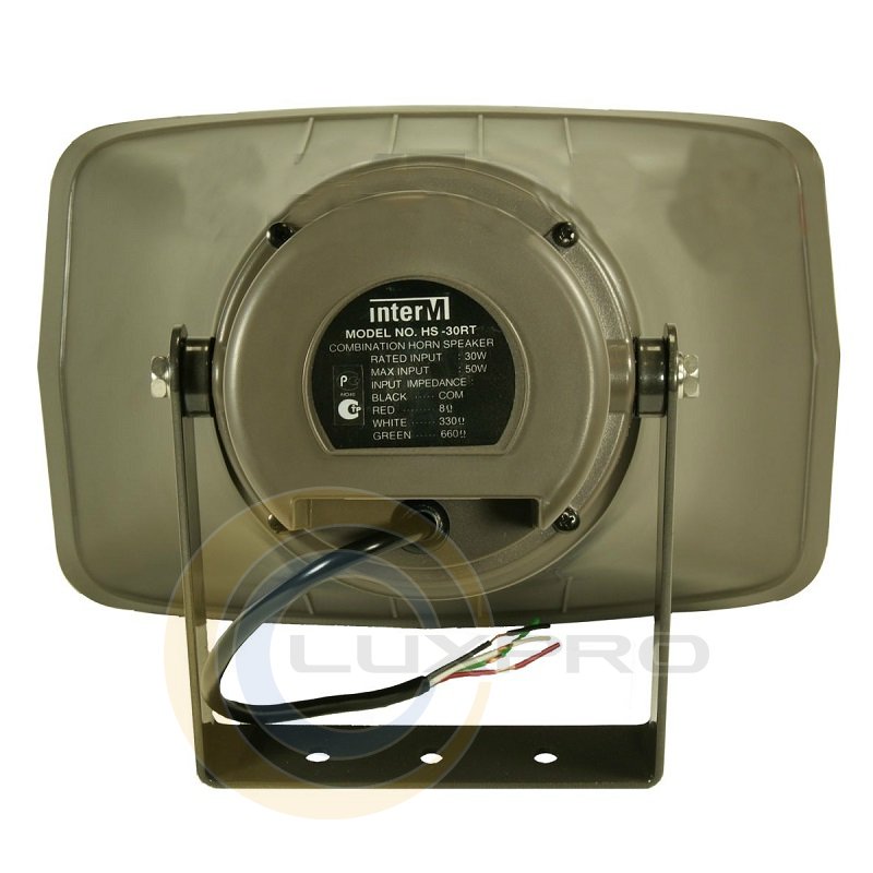 Громкоговоритель рупорный Inter-M HS-30RT пластиковый мощностью 30/15Вт разработан для трансляции преимущественно голосовой информации в комплексных системах оповещения ГО ЧС и СОУЭ, однако может быть использован и для фонового озвучивания в местах с повыщенной зашумленностью (например стадионы, парки, строительные площадки и производственные цеха), где частотные и акустические характеристики не столь важны.