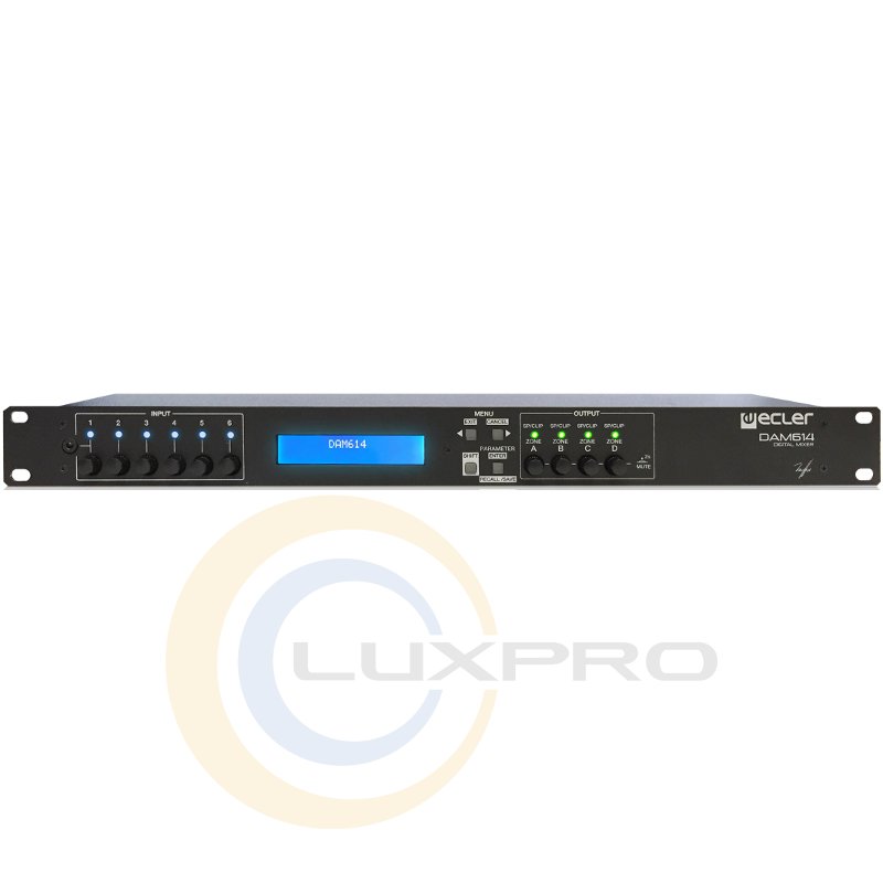 DAM614 - полностью программируемый аудиомикшер. Он включает в себя 6 аудиовходов и 4 аудиовыхода, регуляторы уровня входа и выхода на передней панели, обработку DSP, подключение по RS-232 и 4 порта управления REMOTE (0-10 В постоянного тока). Его 4 выхода могут использоваться как моно-независимые зоны или связаны как стерео-зоны. Что касается входов, то первые 2 являются входами стерео LINE, а 3-й, 4-й, 5-й и 6-й - готовы к использованию MIC/LINE (доступно фантомы), что позволяет использовать их независимо (моно) или как стереосигналы.