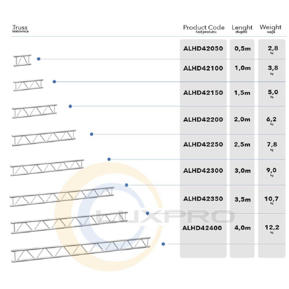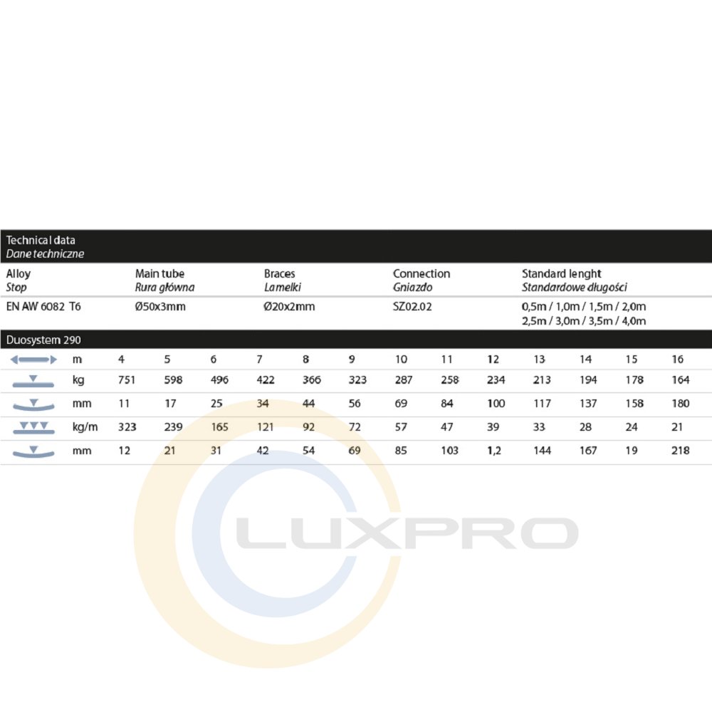 Ферма DUO 290 A выполнена из трубы 50 x 3 мм и перемычек 20 x 2 мм, оборудована коническим коннектором - гнездом SZ 02.02. Алюминиевая ферма благодаря своей конструкции имеет привлекательный, не громоздкий вид и большую выносливость, высокую устойчивость к воздействию на них больших нагрузок. С применением наших систем можно создавать разнообразные конструкции в зависимости от поставленной цели. В том числе алюминиевые фермы могут быть основанием конструкции крыши сцены, могут применяться для создания конструкций выставочных павильонов, конструкций для крепления проекционных и LED экранов, секций для расположения звукового и осветительного оборудования. Качество каждой фермы находится на максимально возможном для подобного вида изделий уровне, что подтверждено сертификатами ISO DIN 4113 и TUV, а каждый элемент прошел несколько стадий проверки качества.