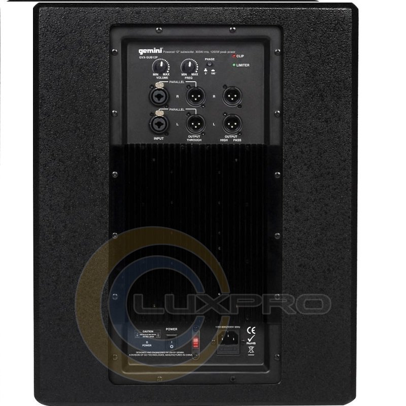 Активный сабвуфер. Сабвуферы серии GVX отличает неповторимый дизайн и качество звука. Новый компактный корпус является оригинальной разработкой компании Gemini. Серия акустики и сабвуферов GVX была полностью переработана с учетом высоких требований профессионалов к качеству звука. Корпуса систем изготовлены из легкого MDF, что обеспечивает портативность, но в тоже время и высокое качество звука. Чёрная водоотталкивающая краска защищает акустику от воздействия окружающей среды.Харaктеристики: