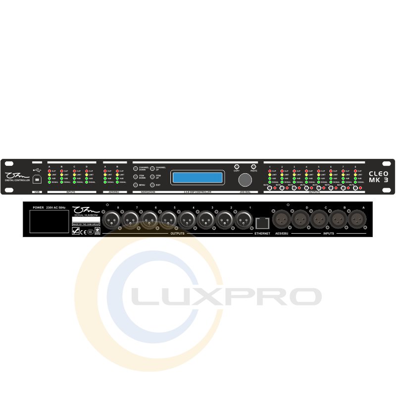 CLEO Mk3 - мощный цифровой процессор сигналов с использованием программного обеспечения Ohm Spyder, включающий те же возможности, что и Oyster plus, а также новые и расширенные функции, масштабируемые для удовлетворения потребностей самых требовательных приложений. Устройство имеет 4 аналоговых входа, цифровой вход AES3 и 8 аналоговых выходов. Комплексная система DSP включает гибкую матрицу маршрутизации и полностью регулируемую цепочку сигналов на каждом входном и выходном каналах. Несколько устройств могут управляться удаленно по проводной или беспроводной сети, подключаясь к маршрутизатору через порт Ethernet, а программное обеспечение Spyder содержит настраиваемые функции группировки для быстрой настройки более чем одного устройства. CLEO также можно контролировать с помощью прямого подключения к компьютеру с помощью USB-порта, или элементы управления передней панели устройства могут использоваться для настройки любой настройки вручную, однако после завершения установки передняя панель может быть заблокирована с помощью программного обеспечения, что делает устройство защищенным от несанкционированного доступа. Встроенная память CLEO Mk3 имеет 100 предустановленных слотов, и как только данные будут загружены, устройство может функционировать полностью автономно.