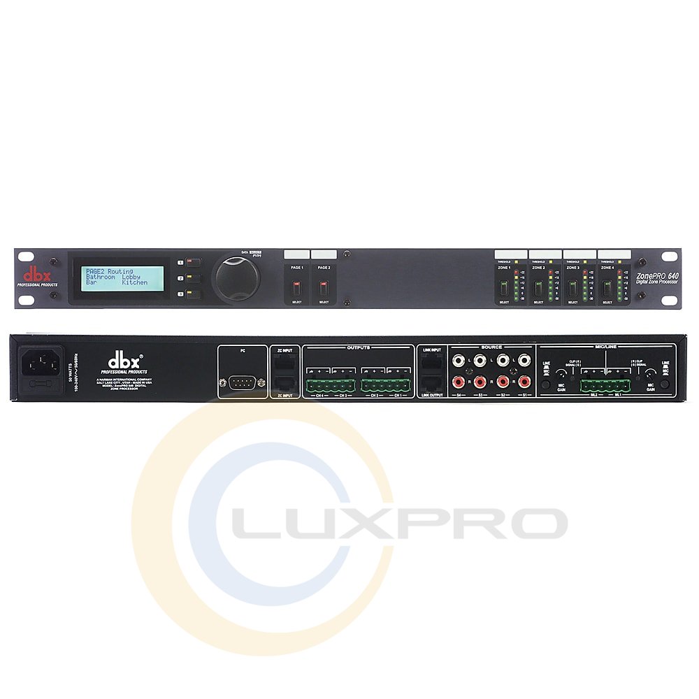 ZonePro 640 разработан для воплощения современной технологии сигнальных процессоров при фонового озвучивания, имея в то же время простой, надежный и удобный интерфейс. От мощных модулей динамической обработки сигналов для многофункционального интерфейса, ZonePro 640 предлагает все необходимые функции, необходимые для постоянных инсталляций. Дополнительно GUI интерфейс дает возможность каждому контрактору быстро установить и оптимизировать шестьсот сороковой с его полным потенциалом.ZonePro 640 продолжает философию семейства Drive Rack: "это все, что Вам необходимо установить между источником сигнала и усилителями". ZonePro 640 имеет шесть входов: два микрофонных / линейных входа на Euroblock разъемах и остальные четыре линейных входа - на двойных RCA разъемах. Выходные разъемы также Euroblock. Каждый входной канал эквалайзер, в то время как микрофонные / линейные входы предлагают также по два блока динамической обработки на выбор: компрессор, Нотч-фильтры, автоконтроль входного уровня, подавитель обратной связи, гейт, де-эсер. Каждая выходная зона - это смикшированного матрица, где каждый из входов может быть выбран главным, приоритетным с полной возможностью Ducking. Каждый выход также обеспечивает режимы Autowarmth ("теплое" звучание), полные пропускные и кросоверни фильтры, параметрические эквалайзеры, динамические модули и исходные линии задержки.Характеристики: