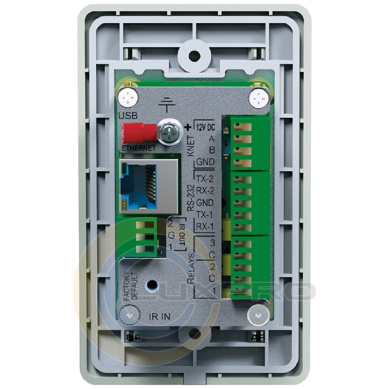 - порты: 2 – RS-232, клеммный блок, 1 – K-NET, клеммный блок, 1 – Ethernet, разъем RJ45 (розетка), 1 – USB (сервисный), 1 – сенсор встроенного ИК-приемник (только для записи сигналов ИК-управления);