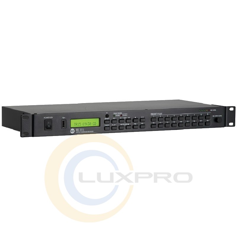 RCF RD2016 — это стереоплеер/рекордер, позволяющий воспроизводить файлы формата MP3 с USB и SD-карт (объемом до 32 Гб). Прибор позволяет формировать пользовательские плей-листы (до 64 файлов максимум). При этом первые 7 файлов могут быть вызваны дистанционно с пульта управления, а первые 18 файлов — с помощью кнопок на передней панели.