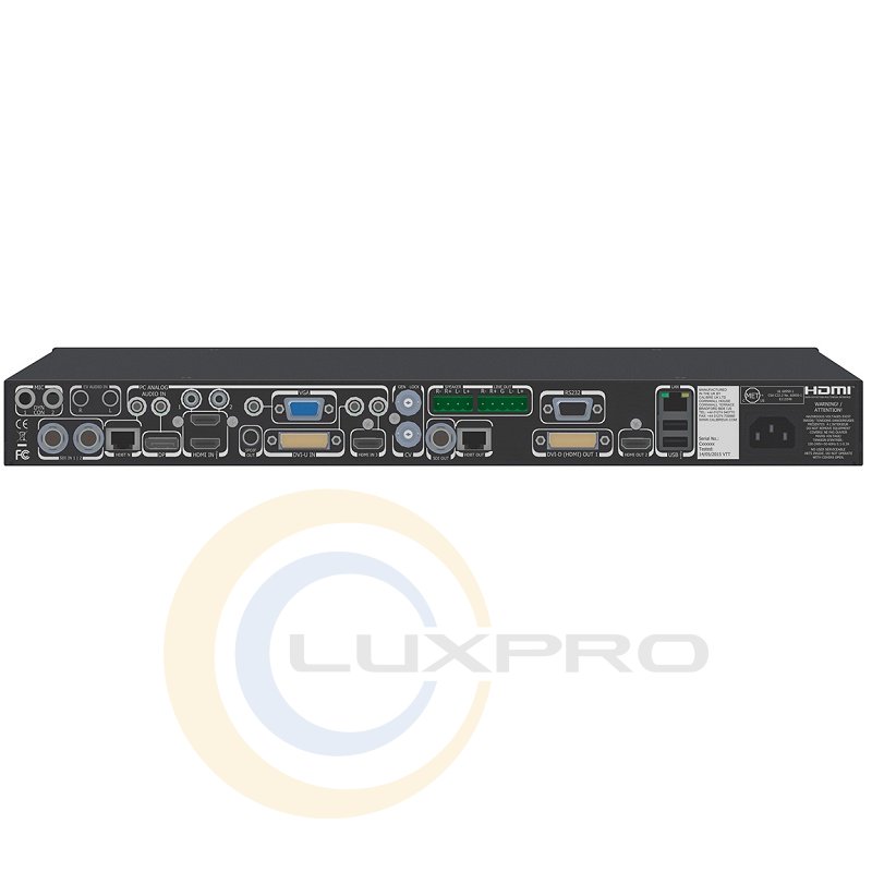 - входы: 1 – HDBaseT, разъем RJ45 (розетка), 1 – DisplayPort, разъем DP 20-pin (розетка), 2 – HDMI 4K, тип А (розетка), 1 – HDMI HD, тип А (розетка), 1 – DVI-U (DVI/HDMI, VGA/RGBS/YPbPr), разъем DVI 29-pin (розетка), 1 – VGA, разъем D-sub HD15 (розетка), 1 – CV, разъем BNC (розетка), 2 – 3G HD-SDI, разъем BNC (розетка), 1 – Ethernet (видеопоток H.264), разъем RJ45 (розетка), 1 – Genlock, разъем BNC (розетка), 2 – микрофонный (доступно фантомное питание 48 В), разъем Jack 6,3 мм (розетка), 1 – небалансное стерео, разъемы 2xRCA (розетка), 7 – небалансное стерео, разъем mJack 3,5 мм (розетка);