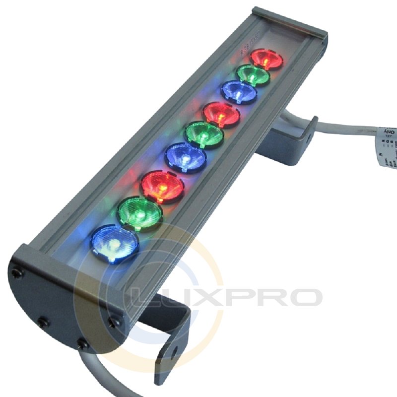 В основе работы полно цветного (RGB) светодиодного светильника ( wall washer ) лежит технология смешивания трех основных цветов: R – красный, G – зеленый, B – синий, с помощью чего можно синтезировать более 16 000 000 цветов свечения. Такими прожекторами можно создать оригинальную подсветку развлекательных заведений, ресторанов, кафе, магазинов. При ширине 64mm, светильники удобно монтировать вдоль стен, при низком потолке, на колоннах и столбах, в нишах, на карнизах и т.д. Светильники работают абсолютно бесшумно благодаря отсутствию вентиляторов (конвекционная система охлаждения), что делает их идеальным решением для постановок на открытом воздухе, а также наружных и внутренних арт-инсталляций. К характерной особенности линейки стоит отнести применение современных высокоэффективных полупроводниковых источников света мощностью 3W известных брендов.Светильники обеспечивают значительную экономию электроэнергии и высокий ресурс (не менее 50 000 ч.). Не требуют постоянного сервисного обслуживания.Светильники применяются совместно со специализированными блоками управления DriverBox-3-XX-XXX.Блоки управления DriverBox-3-XX-XXX позволяют управлять светильниками по цифровому протоколу DMX512 и работать автономно по встроенным RGB программам. Для шоу инсталляций рекомендуем применять блоки управления DriverBox-3-XX-XXX-LD. Они обладают рядом преимуществ в сравнении с классическими моделями. Для оптимизации проекта «маленькие» светильники (на 3, 6, 9 LED) могут подключатся последовательно в виде "гирлянд".То есть на один RGB канал DriverBox-3 может подключатся: