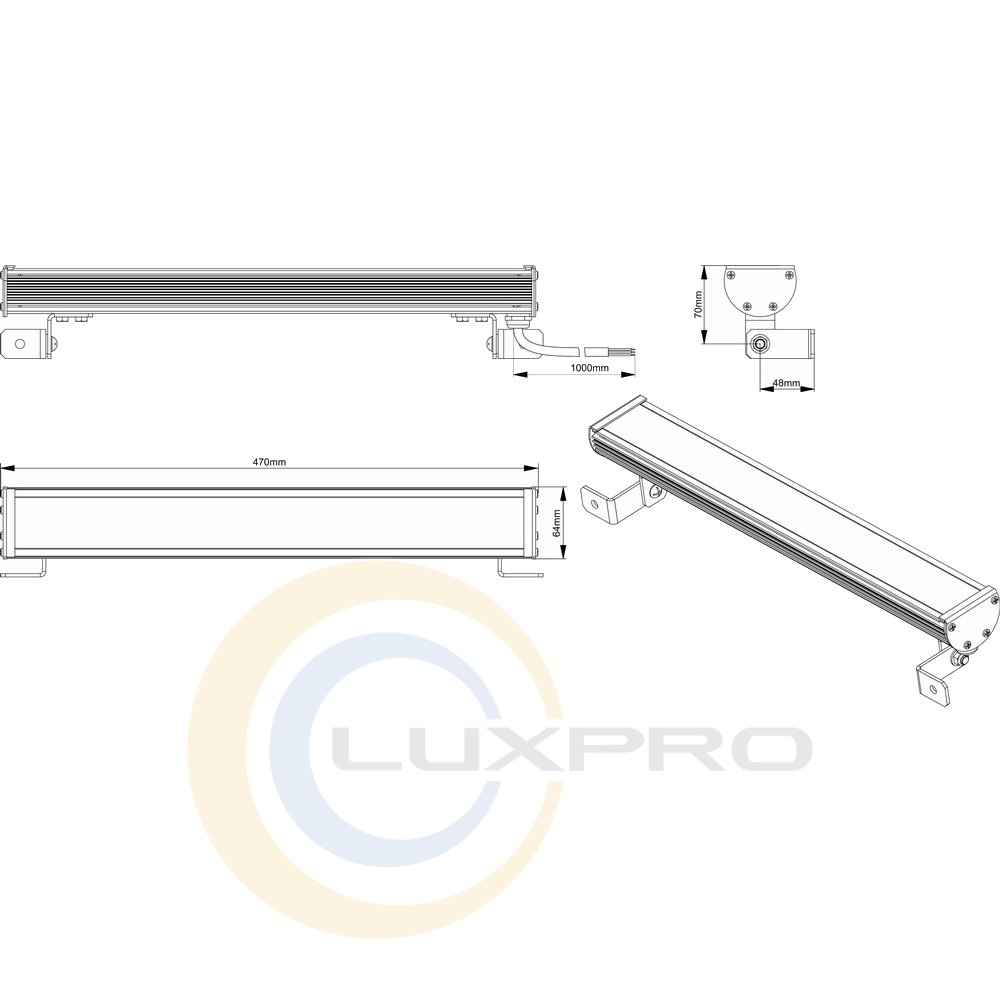 В основе работы полно цветного (RGB) светодиодного светильника ( wall washer ) лежит технология смешивания трех основных цветов: R – красный, G – зеленый, B – синий, с помощью чего можно синтезировать более 16 000 000 цветов свечения. Такими прожекторами можно создать оригинальную подсветку развлекательных заведений, ресторанов, кафе, магазинов. При ширине 64mm, светильники удобно монтировать вдоль стен, при низком потолке, на колоннах и столбах, в нишах, на карнизах и тд. Светильники работают абсолютно бесшумно благодаря отсутствию вентиляторов (конвекционная система охлаждения), что делает их идеальным решением для постановок на открытом воздухе, а также наружных и внутренних арт-инсталляций. К характерной особенности линейки стоит отнести применение современных высокоэффективных полупроводниковых источников света мощностью 3W известных брендов.Светильники обеспечивают значительную экономию электроэнергии и высокий ресурс (не менее 50 000 ч.). Не требуют постоянного сервисного обслуживания. Светильники применяются совместно со специализированными блоками управления DriverBox-3-XX-XXX. Блоки управления DriverBox-3-XX-XXX позволяют управлять светильниками по цифровому протоколу DMX512 и работать автономно по встроенным RGB программам. Для шоу инсталляций рекомендуем применять блоки управления DriverBox-3-XX-XXX-LD. Они обладают рядом преимуществ в сравнении с классическими моделями. Для оптимизации проекта «маленькие» светильники (на 3, 6, 9 LED) могут подключатся последовательно в виде "гирлянд".То есть на один RGB канал DriverBox-3 может подключатся:
