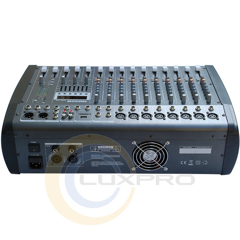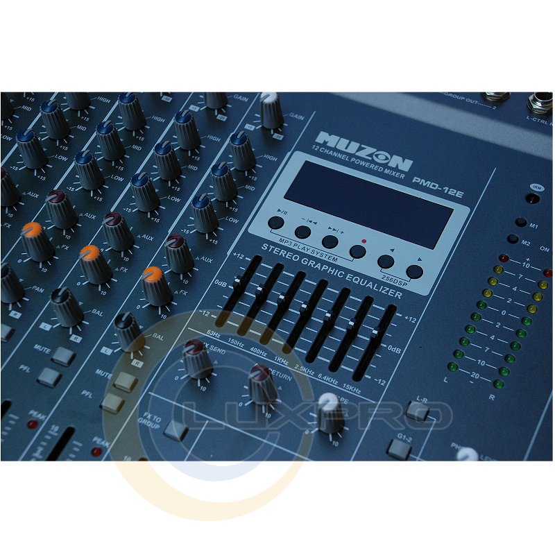 Muzon PMD 12 E - активный микшерный пульт позволяет подключить до 8 микрофонов с фантомным питанием. Мощность усилителя пульта 2x300 Вт. Для более точной настройки активный микшер оборудован 3-х полосным эквалайзером на каждом канале, и общим 7 полосным эквалайзером. Процессор эффектов имеет разрядность 32 bit и насчитывает 258 эффектов, в которых каждый музыкант найдет нужные эффекты для своего вокала. Имея аналоговый блок питания, вес пульта составляет всего лишь 8 кг. Богатый функционал, малый вес делают этот пульт прекрасным выбором для проведения музыкальных мероприятий.