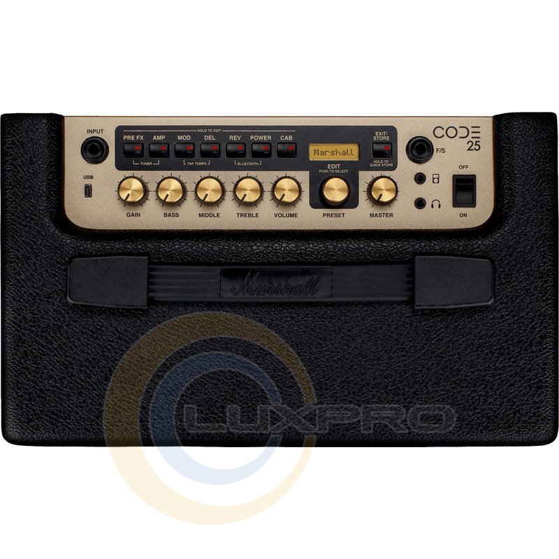 Полностью программируемый гитарный усилитель MARSHALL CODE-25 сочетает в себе подлинное моделирование классических и современных тонов компании MARSHALL с профессиональными FX. Усилитель для электрогитары MARSHALL CODE25 имеет 14 MST предусилителей, 4 MST усилителей и 8 MST кабинетов, а также 24 FX, включая: Compressor, классическая педаль Distortions, Auto Wah, Pitch Shifter, Chorus, Phaser, Flanger и Tremolo, плюс Delays с Tap Tempo, и студийного качества Reverbs. CODE MST предусилители - это воссоздание самых знаменитых и полюбившихся Marshall тонов: JTM45 2245, 1962 Bluesbreaker, 1959SLP Plexi, JCM800 2203, JCM2555 Silver Jubilee, JCM2000 DSL100, JVM410H. MARSHALL CODE 25 имеет звучание усилителей EL34, 5881, EL84 & 6L6 MST, и MST кабинеты моделей: 1960, 1960V, 1960AX, 1960HW, 1936, 1936V, 1912 & 1974X.Управлять комбоусилителем MARSHALL CODE25 можно по Bluetooth и передавать аудио из iOS или Android устройств, используя Gateway приложение. При подключении по USB цифровой комбоусилитель можно использовать в качестве DAW интерфейса для записи и потока аудио из компьютера. Также через специальный аудио вход можно подключить МР3 плеер и играть вместе с любимыми треками или подключить наушники для персональной практики. А подключив педаль (PEDL-91009, приобретается отдельно), Вы сможете управлять функциями панели и назначать до 30 пресетов.Характеристики: