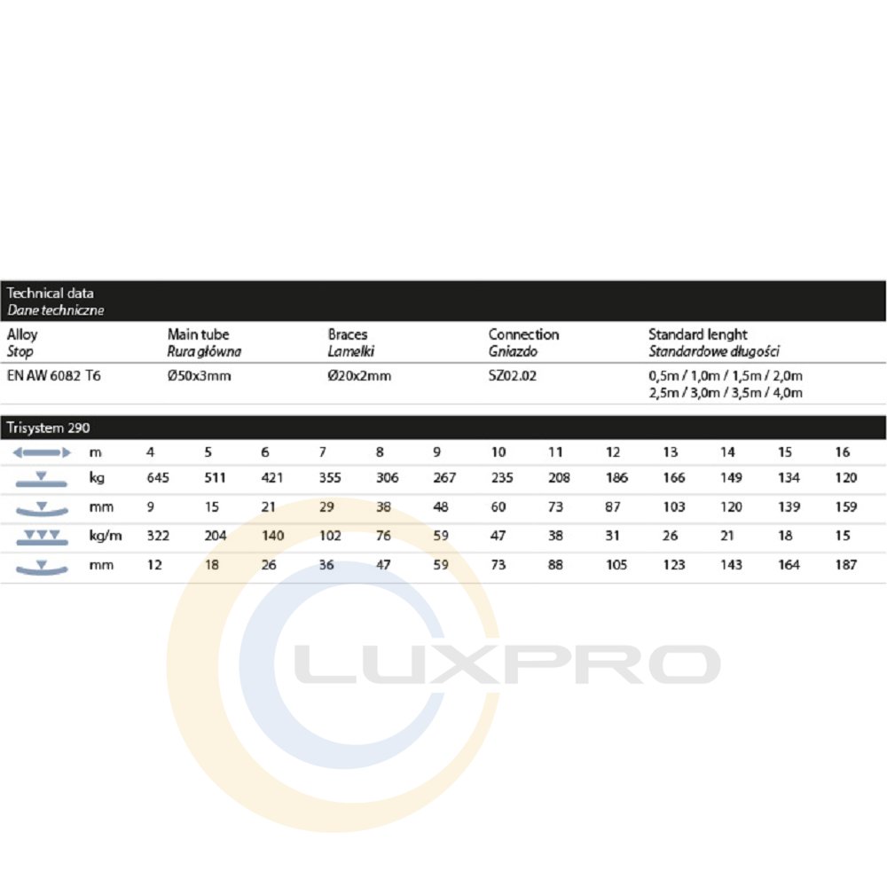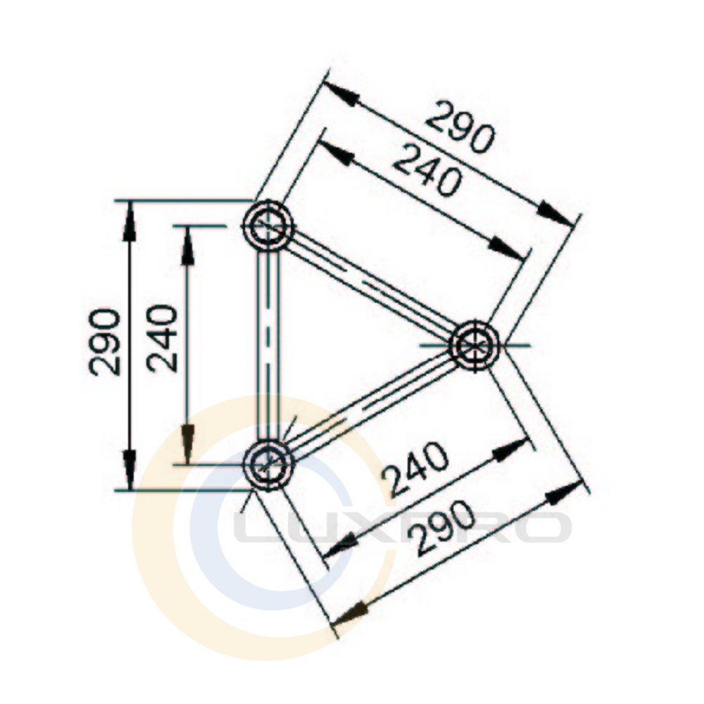 Ферма TRI 290 A выполнена из трубы 50 x 3 мм и перемычек 20 x 2 мм, оборудована коническим коннектором - гнездом SZ 02.02. Алюминиевая ферма благодаря своей конструкции имеет привлекательный, не громоздкий вид и большую выносливость, высокую устойчивость к воздействию на них больших нагрузок. С применением наших систем можно создавать разнообразные конструкции в зависимости от поставленной цели. В том числе алюминиевые фермы могут быть основанием конструкции крыши сцены, могут применяться для создания конструкций выставочных павильонов, конструкций для крепления проекционных и LED экранов, секций для расположения звукового и осветительного оборудования. Качество каждой фермы находится на максимально возможном для подобного вида изделий уровне, что подтверждено сертификатами ISO DIN 4113 и TUV, а каждый элемент прошел несколько стадий проверки качества.