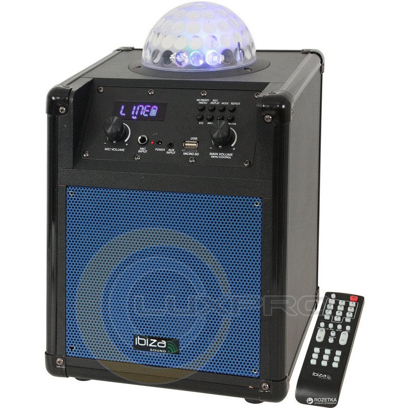 Портативная переносная акустическая система IBIZA KUBE60-BL с питанием от встроенного аккумулятора или от сети питания, с усилителем и световым эффектом RGB для мобильного и караоке использования.