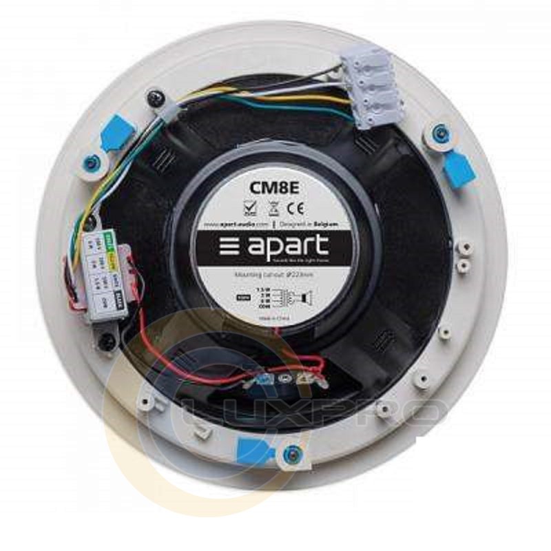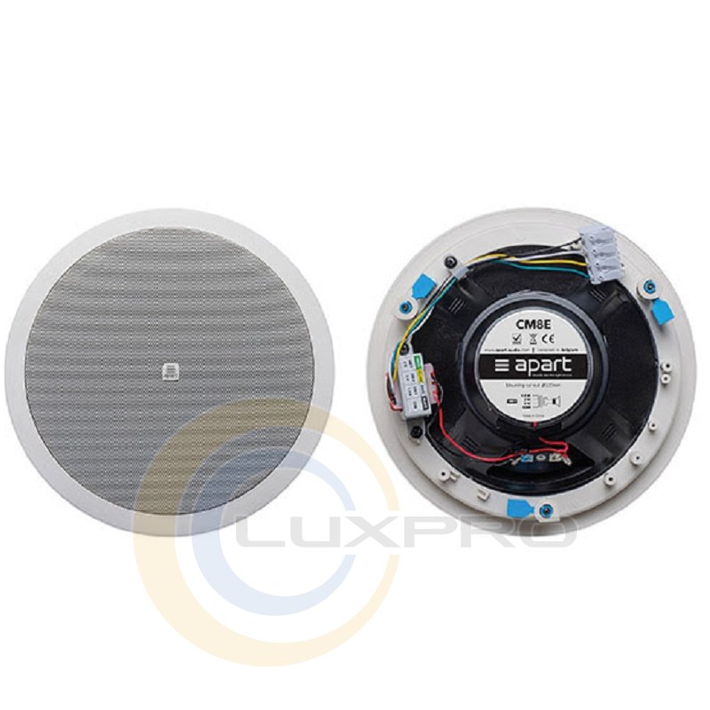 APART CM8E - 2-полосная встраиваемая акустическая система с согласующим трансформатором 100В. Благодаря большому низкочастотному динамику 8" (20см), CM8Е обеспечивает лучшую отдачу в области низких частот, а 2-полосная конструкция гарантирует сбалансированный, мощный, прозрачный и теплый звук, который охватывает полный диапазон частот даже на высоких уровнях громкости.Помимо стандартного применения, CM8Е подходит для использования в среде с повышенной влажностью. Это возможно благодаря использованию высококачественных, не подверженных коррозии материалов: корпус из ABS пластика, решетка из алюминия, диффузор из полипропилена. Класс защиты от факторов внешней среды - IP54.Система крепления АС - 3-х кулачковая. Перед установкой необходимо аккуратно снять защитную решетку и при помощи отвертки или шуруповерта закрепить АС в предварительно вырезанном монтажном отверстии.Подключение АС осуществляется через безвинтовую клеммную колодку Quick Fix, что не требует дополнительного инструмента и существенно экономит время монтажа.Характеристики: