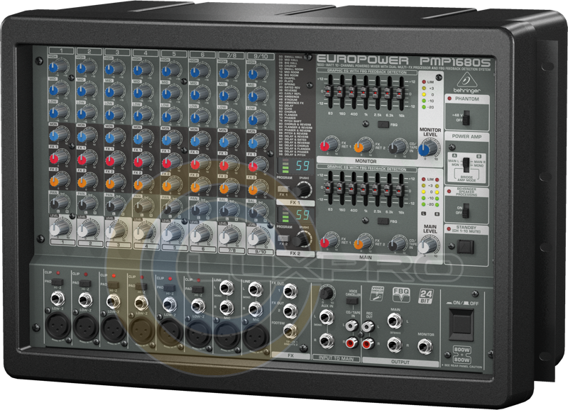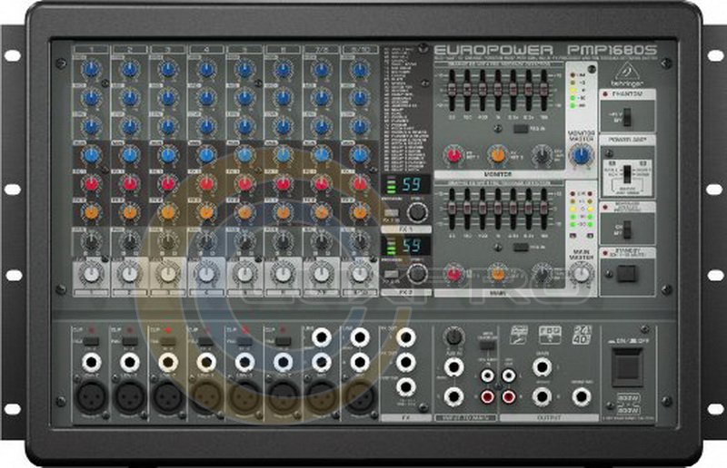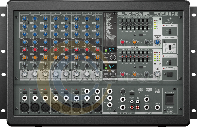 Микшерный пульт PMP1680S 1600-ваттный 10-канальный микшерный стереопульт с 8 микрофонными входами, 6 линейными моновходами, 2 линейными стереовходами, 2 мультиэффектпроцессорами, двумя 7-полосными графическими мастер-эквалайзерами, функцией Voice Canceller и системой обнаружения обратной связи FBQ.