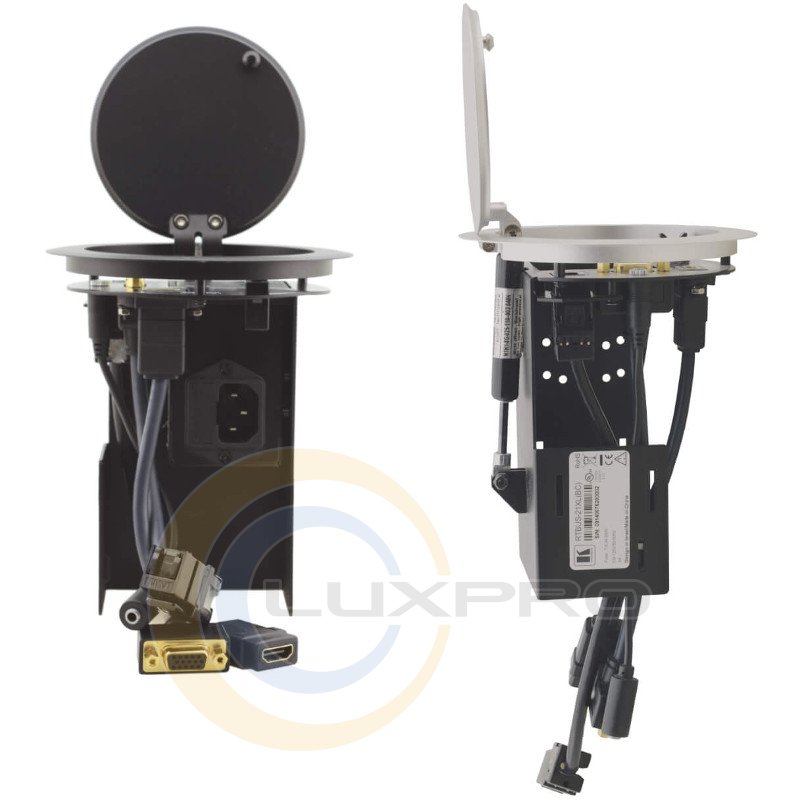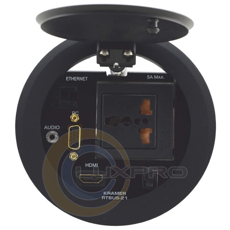 Kramer RTBUS-21XL(B) - модуль для подключения кабелей. Крышка с пневмолифтом. Коробка с набором разъемов для подключения аудиовизуальной аппаратуры, располагается под деревянной столешницей или подиумом коммутационная. Коробка соединяется с презентационной системой помещения.