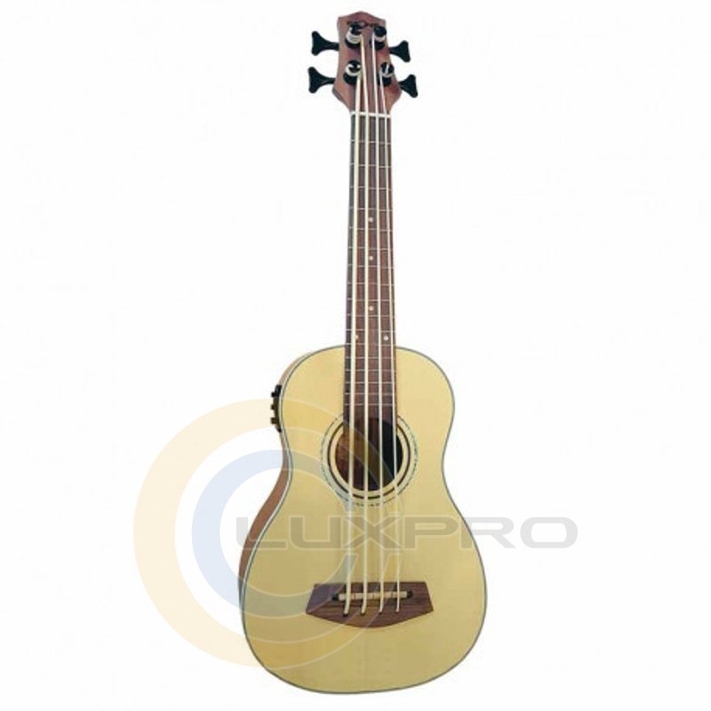 FZONE FZUB-003 - бас-укулеле, красивый и многофункциональный музыкальный инструмент для концертных выступлений, который обладает элементами укулеле и классической бас-гитары. Корпус этой компактной гавайской гитары изготовлен из тщательно отобранной цельной ели (топ) и сапеле (боковины и задняя стенка). Для изготовления грифа также использовалось сапеле, накладки грифа и мостика - сонокелинг. Резонаторное отверстие украшено красивыми вставками из абалоне. Присутствует белая окантовка по периметру верхней и нижней деки. Среди других особенностей данной модели стоит выделить открытый колковый механизм черного цвета, предназначенный для настройки инструмента, а также маркировку ладов, выполненную в виде точек.